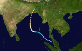 Map plotting the storm's track and intensity, according to the Saffir–Simpson scale