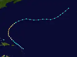 Floyd was first tracked as a tropical depression on September 3 when it organized east of the Leeward Islands. As the depression moved northwest, it caused heavy rain. The highest rainfall reported was 5.7 inches (140 mm) at Antigua. It strengthened into a tropical storm, then reached hurricane strength on September 7.[13] Floyd turned to the northeast and passed just southeast of Bermuda as a weakening hurricane. As a tropical storm, Floyd moved east across the Atlantic until losing its identity on September 12.[13]