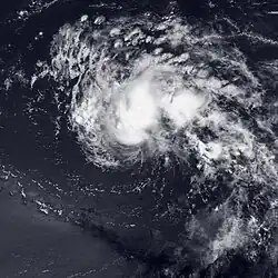 An area of disturbed weather organized into a tropical depression southwest of the Cape Verde Islands on July 27.[8][14] The depression moved generally west-northwestward across the deep Atlantic for several days,[8] but failed to strengthened significantly due to strong upper-level wind shear.[15] The depression dissipated near the northern Leeward Islands on August 2.[8]