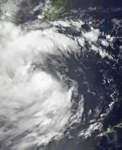 This system formed well north of the normal climatological position to the west of Dom, as the monsoon trough was similarly displaced. It was first noted on August 25, but showed no further development. Thunderstorms were located about 300 miles (480 km) south of the center, but since the central pressure was under 1000 mb, it was considered a tropical depression while an exposed low level swirl. The system did develop some central convection, and moved northward into South Korea, bringing showers to the region, and dissipated late on August 27.[17]