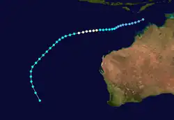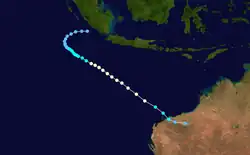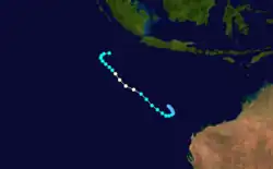 Cyclone Margot was a tropical cyclone that stayed out to sea during its entire duration. It was first identified on 10 April, off the coast of Sunda Strait. Margot then traveled to the southwest during 12 April, gradually intensifying to a tropical cyclone. In the noon hours of 13 April, it began to move to the southeast, under the influence of an intense high-pressure area to the south. The cyclone reached a peak intensity on 14 April, as a category three cyclone using the Australian scale, with winds of 155 km/h (95 mph). This intensity was based on satellite estimates, but the strongest report was from a ship eighteen hours earlier. After peak intensity Margot gradually weakened up until the 19, when it briefly underwent intensification, and turned west. This was short lived however, as dry, easterly low-level winds and wind shear began to influence the cyclone. Margot began to rapidly weaken and move in an easterly direction on 20 April. On the 21 Margot had become a remnant low after completing a figure-eight path. On the 25 the remnant low was absorbed by a broad low-pressure system located in the northeast Indian Ocean.[18]