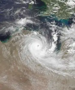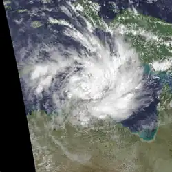 Tanya maintained its peak intensity for around 24 hours, before it started to weaken as it approached Cape York during 31 March.[15][16] The system subsequently made landfall near Coen on the Cape York Peninsula, at around 14:00 AEST (0400 UTC) on 1 April and rapidly weakened below tropical cyclone intensity.[15][17] Tanya's remnant tropical low was last noted by the BoM later that day as it moved towards the centre of Cape York.[15][16] However, over the next couple of days, the JTWC continued to monitor Tanya's remnants as they moved across the Gulf of Carpentaria, before they made landfall and dissipated over the Arnhem Land during 4 April.[3][16] Tanya caused some minor damage to vegetation, while there were no deaths or structural damage reported.[15][17]