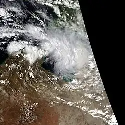 The newly named system subsequently passed over the Cobourg Peninsula into the Van Diemen Gulf, where it started to moved south-westwards and passed just to the north-west of Darwin at about 06:50 ACST on 13 April (21:20 UTC, 12 April).[19][20][21] The BoM subsequently reported that Gretel had peaked as a category 2 tropical cyclone, with 10-minute sustained winds of 95 km/h (60 mph), after sustained winds of 84 km/h (52 mph) were recorded at Darwin Airport.[19][21] Over the next couple of days, Gretel moved south-westwards parallel to the coastline of the Northern Territory, as upper-level windshear caused the systems low-level circulation centre to become displaced from the surrounding atmospheric convection.[19][21] During 14 April the system weakened into a tropical low, while it was located near Port Keats, before it dissipated over the Northern Territory.[21][22]