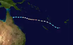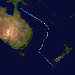 During the middle of January, an ill-defined tropical low formed within the Intertropical Convergence Zone, near the Cape York Peninsula and moved eastwards into the Coral Sea.[2] Over the next few days, the system moved eastwards into the Coral Sea, before its circulation became better defined during 14 January.[2] The system continued to move eastwards over the next couple of days, before the JTWC initiated advisories on the system and designated it as Tropical Cyclone 13P on 16 January. [3] Later that day, as the system approached 160°E and the South Pacific basin, TCWC Brisbane reported that the low had become a tropical cyclone and named it Nigel.[2][4] The newly named system subsequently moved out of the Australian region later that day, with 10-minute sustained winds of 110 km/h (70 mph), which made it a Category 2 tropical cyclone on the Australian scale.[2][4] Nigel caused no damage while located within the Australian region, however, the system later caused significant impacts to Fiji and Vanuatu.[2][5]