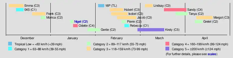 Pierre 18 – 24 February 1985 Category 2 tropical cyclone 95 km/h (60 mph) 986 hPa (29.12 inHg) Queensland Minimal None [6][7]