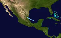 By September 6, the disturbance had emerged into the southwest Gulf of Mexico and consolidated into a smaller system which had enough organization to be classified as a tropical depression, the seventh of the season. The depression moved north-northwest into northeast Mexico on the afternoon of September 7, dissipating completely on September 8.[20]