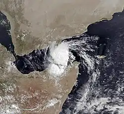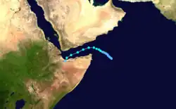 On May 23 a tropical disturbance developed 180nm (333km) southwest off the island of Socotra. The disturbance moved slowly northwestward as it developed into a tropical depression on May 24, as the system gradually strengthened to a tropical storm on May 26 and being designated 01B by the JTWC. Shortly after being designated, 01B began a gradual turn to the west, then southwest as it entered the Gulf of Aden. 01B attained its peak intensity of 50 mph early on May 27, before weakening until making landfall 35 nm (65km) west of Berbera, Somalia as a 40 mph tropical storm early on May 28. The storm rapidly dissipated overland that same day. There were no reports of damages or deaths from the storm. [3]