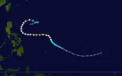 Gay was the third tropical cyclone and first typhoon of the 1985 Pacific typhoon season. After over four months of inactivity, on May 16, a strong atmospheric circulation formed 380 nmi (700 km) west of Koror, now part of Palau. The circulation began to develop convection and by May 20 had organized into a depression. Heading north, the storm took two days to gain tropical storm strength, likely because a tropical upper tropospheric trough (TUTT) was so close to the north, restricting outflow. However, the trough soon weakened and outflow improved and the storm began to intensify faster. Gay became a typhoon early on May 23, continuing to intensify, Gay came under influence of a frontal boundary to the northwest and began to recurve to the northeast, through a weakness in the subtropical ridge created by the trough associated with the frontal boundary. This trough began to build and dig southeastward, pouring fuel into Gay's engine. Typhoon Gay reached its peak intensity of 100 knots (120 mph; 190 km/h) on May 24. As cool, dry air became entrained within Gay's circulation, the cyclone began to weaken. Gay underwent extratropical transition as it interacted with the frontal boundary. Gay became extratropical shortly after weakening to a tropical storm early on May 26.[2]