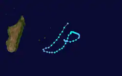 While Bemezava was still active, another circulation was present between Réunion and Madagascar on February 8. On the next day, a tropical disturbance formed about 150 km (95 mi) east-southeast of Toamasina, Madagascar. A ridge to the south caused the nascent system to move erratic, although generally to the southeast and east. It intensified into Tropical Storm Clotilda on February 10,[16][17] and on the next day that the JTWC classified it as Tropical Cyclone 17S.[2] The storm slowed and approached within 50 km (30 mi) of Réunion before stalling. It moved slowly near the island for two days, during which it remained about 30 km (18 mi) off the northern coast. On February 13, Clotilda attained peak 10 minute winds of 110 km/h (70 mph). A weak ridge steered the storm back to the southwest, and on February 14, Clotilda struck northern Réunion at Sainte-Suzanne. The ridge moved to the east, causing the storm to accelerate and gradually weaken. On February 17, Clotilda became extratropical while turning southeastward due to an approaching trough. The remnants persisted several days until dissipating on February 22 near Île Amsterdam.[16][17]