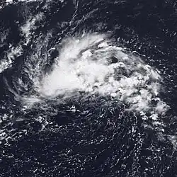 First spotted as a tropical disturbance near the Lesser Antilles on November 15, the system moved generally northward while slowly developing. The system organized into a tropical depression on November 18 and quickly strengthened into a tropical storm. The storm curved northeast and strengthened further, reaching hurricane strength on November 20. However, a surface high-pressure system to the north caused the storm to weaken as the vertical wind shear increased over its center. Frances was later absorbed by an extratropical cyclone on November 21.[38]