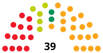Last election 18 seats, 44.0%[a] 15 seats, 38.4% 2 seats, 6.7%