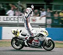 Race winner Kevin Schwantz, celebrating after winning the 500cc race.