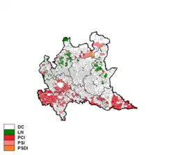 | Province | DC | Lega | PCI | PSI | LV+VA | MSI | PRI | PP | Others | Total |