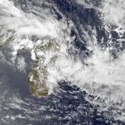 The ITCZ remained active in early March, spawning a tropical depression in the northern Mozambique Channel on March 2. It failed to organize at first, although an increase in convection on March 3 allowed the system to strengthen into Tropical Storm Ionia.[4] That day, it attained peak winds of 65 km/h (40 mph).[16] After passing about 50 km (30 mi) north of Juan de Nova island, Ionia progressed southeastward and approached the western Madagascar coastline. The circulation paralleled the coast for about 250 km (160 mi) before moving ashore at Belo on March 4. The storm weakened over land, re-emerging over open waters on March 5 from southeastern Madagascar. Ionia briefly re-intensified into a tropical depression that night,[4] but it lost tropical characteristics on March 7.[16] The remnants persisted several more days until dissipating south of the Mascarene Islands on March 11.[4]