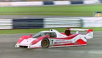 Having taken a year out from the championship, Toyota returned with a new SWC car, the TS010. This was the first racing Toyota not designed by a Japanese engineer, but instead came out of the TOMS-Europe facility.[17] Tony Southgate, designer of Jaguar's Le Mans-winning XJR-12, was brought on board as project co-ordinator. The car was built around the completely new 3.5-litre RV10 engine. The all-aluminium block had a 72° V10 with two valves per cylinder and could develop 660 and was fitted to a 6-speed gearbox. The chassis was a carbon/kevlar composite, with a very low profile and, like Peugeot, developed strong downforce with a large twin-plane rear wing.[17] The car was unveiled for the last race of the ’91 season and had a good start to the new season by winning the opening round at Monza by default, albeit as the sole classified finisher. Drivers Geoff Lees and Hitoshi Ogawa had raced for the team for a number of years, however Ogawa was tragically killed in May in an All-Japan Formula 3000 race.[18][14] His place was taken by Australian David Brabham (ex-Jaguar) with Ukyo Katayama as the third driver. The second car had also pulled in drivers from the TWR team, with Jan Lammers and Andy Wallace who had reigning Drivers Champion Teo Fabi as their drop-in third driver. The third car would be driven by Kenny Acheson/Masanori Sekiya/Pierre-Henri Raphanel.