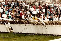 The best hurdler since Sherrys Prince emerged, a white and brindle dog called Kildare Slippy. The Paddy Hancox trained greyhound had reached the 1991 Grand National final, at Hall Green. He won the 1992 Grand National final by 9¾ lengths recording 28.52, a new track record. When the time was announced it stunned the crowd because the track record for 474 metres on the flat at Hall Green was 28.56. Kildare Slippy had just jumped five hurdles and completed the circuit four spots (1 spot = 0.01 sec) faster than the existing flat record making it one of the greatest individual runs in history. In addition to the run he broke the track record at Catford setting new figures of 23.73 which was faster than the Scurry Gold Cup final. A 28.09 track record at Powderhall was just nine spots slower than the time set by Murlens Abbey (the eventual greyhound of the year) in the Edinburgh Cup final. He won the Scottish Grand National before he attempted to win the Irish Grand National. Despite a new track record at Shelbourne Park in an incredible 29.18, he missed the break in the final and failed to achieve the triple crown. A Linda Mullins trained hurdler called Deerpark Jim won 31 races form 45 starts and was denied greater success because Kildare Slippy was around the same time.[13][14][1]