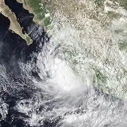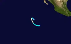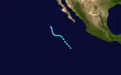 A large area of disturbed weather persisted south of Mexico for several days, perhaps enhanced by a westward-moving tropical wave that departed Africa on June 12. The disturbance organized into a tropical depression around 00:00 UTC on June 27 while located about 115 mi (185 km) south of the Gulf of Tehuantepec. The newly designated cyclone moved generally toward the northwest, passing about 60 mi (97 km) offshore Mexico near Puerto Escondido on its closest approach.[8] Although the depression developed a symmetrical area of convection on June 30,[9] it soon passed over cooler ocean waters and began to become disheveled.[10] The system dissipated a short distance north of La Paz, Baja California Sur, around 00:00 UTC on July 2.[8]