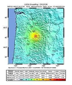 4. ^ Dewey, James W.; Reagor, B. Glen; Johnson, Dennis A.; Choy, George L.; Baldwin, Frank W. (1994). "The Scotts Mills, Oregon, earthquake of March 25, 1993; intensities, strong-motion data, and teleseismic data" (PDF). Open-File Report 94-163. United States Geological Survey.