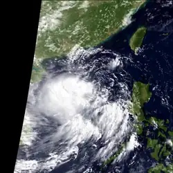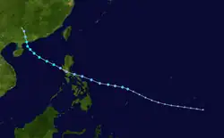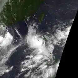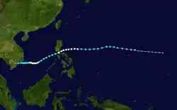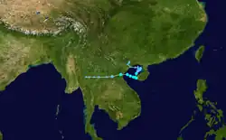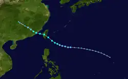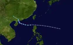 The first warning was issued a day later when the amount of deep convection near the centre increased as the depression neared the Philippines. While over the Philippine islands, a large mesoscale convective system (MCS) developed near the centre of the tropical depression, something that would occur again later while the system was west of Luzon.[15] Soon after the second MCS weakened, the system made landfall in central Vietnam on May 26, and quickly dissipated when inland.[4] The Hong Kong Observatory tracked this system as a weak tropical depression from May 25 UTC when it was about 520 km (320 mi) southeast of Xisha for about 24 hours before it dissipated.[1]