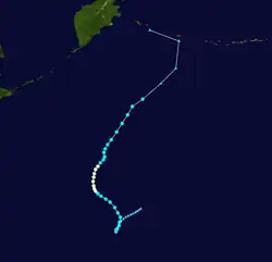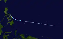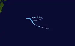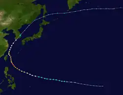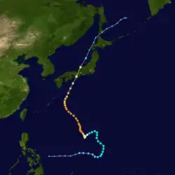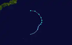 Page moved on a northwestward track for the next couple days while slowly strengthening.[11] Page was upgraded to a tropical storm by the JTWC late on May 12,[12] when it was located 500 kilometres (310 mi) north of Yap,[4] while the JMA first considered the system a tropical storm on May 13.[7] Late on May 13, Page suddenly slowed in forward speed and began turning to the northeast. On May 14, Page became a typhoon.[11][12] However, the JMA did not follow suit until 30 hours later.[7] Page reached its maximum intensity of 90 knots (170 km/h) and minimum pressure of 965 hectopascals (28.5 inHg) thirty hours after passing the point of recurvature.[11] Final warnings were issued by both the JTWC[11] and the JMA[7] early on May 18, as it began extratropical transition around 960 kilometres (600 mi) east-southeast of Tokyo.[11]