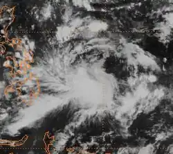 On May 14, an area of deep convection associated with a weak cyclonic circulation near Kosrae was mentioned in the JTWC's 0600 UTC Significant Tropical Weather Advisory. For the next five days, this weak circulation tracked west-northwestward in the direction of Guam, before turning to the west-southwest, but convection failed to consolidate near the centre during this time.[15] After passing close to Palau on May 21, it turned northwest and entered the Philippine Sea, and was named Deling by PAGASA early on May 23 local time. Shortly after, SSM/I imagery indicated the presence of a well-defined low-level circulation centre, and visible and infrared satellite images indicated an increase in organisation of the system and a consolidation of deep convection near the centre. Based on this, a Tropical Cyclone Formation Alert was issued by the JTWC at 0600 UTC.[15]