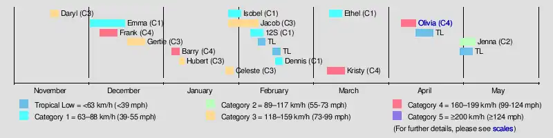 Gertie 17–22 December 1995 Category 3 severe tropical cyclone 140 km/h (85 mph) 965 hPa (28.50 inHg) Australia None [9]