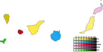 1. ^ Results for AIC (20.1%, 10 seats)—not including Fuerteventura and Lanzarote—ICAN (12.2%, 5 seats)—not including El Hierro—PNC (1.1%, 0 seats) and AM (0.7%, 2 seats) in the 1991 election.