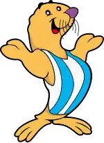 The mascot, Lobi, is a sea lion, an animal commonly found in the waters of Mar de Plata. He stands for the host city and is displayed with welcoming open arms. The words in the poster are constructed to imply a launching point or podium.[4]