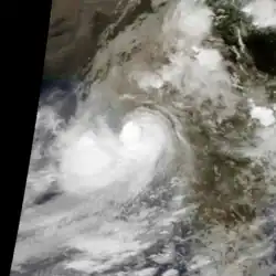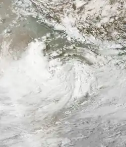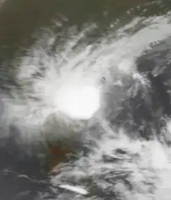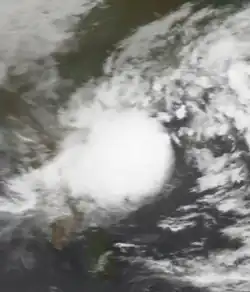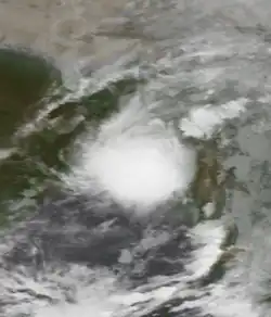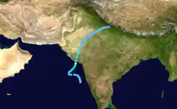 While the previous storm was paralleling the east Indian coastline, another disturbance formed off the west coast on June 15, also associated with the monsoon. The new area of convection persisted,[3] developing a distinct circulation by the next day. Early on June 17, a depression developed about 365 km (227 mi) west of Mumbai.[1] At 18:00 UTC that day, the JTWC classified it as Tropical Cyclone 04A, after the wind field became more defined.[3] The system moved to the northeast within the influence of the monsoon, and quickly intensified due to an anticyclone aloft providing favorable conditions.[1][18] On June 18, the IMD upgraded the system to a cyclonic storm, and further to a severe cyclonic storm by 18:00 UTC that day. At 23:00 UTC, the storm made landfall on Gujarat near Diu, only the fourth cyclone since 1891 to strike the state in June. An hour later the IMD assessed peak 3-minute winds of 110 km/h (70 mph), based on the appearance of an eye feature.[1] Meanwhile, the JTWC assessed slightly stronger 1-minute winds of 120 km/h (75 mph), equivalent to a minimal hurricane.[3] The storm turned northward and slowly weakened, degenerating into a remnant low over Rajasthan on June 20 before being swept up by an approaching trough.[1]