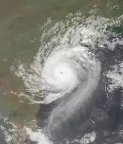 Ahead of the storm, about 225,000 families evacuated,[1] although many towns lacked proper storm shelters.[34] When the cyclone made landfall, it produced strong winds up to 100 km (62 mi) inland, dropped 210 mm (8.3 in) of rainfall across a 40 km (25 mi) region, and flooded over 250 villages along 60 km (37 mi) portion of the coast.[1][35] About 70% of the overall damage was in East Godavari district,[36] where two villages were entirely destroyed.[1] The storm destroyed 241,802 ha (597,510 acres) of crops and killed millions of cattle and chicken.[1][37] Across Andhra Pradesh, the storm damaged 647,554 houses, including over 10,000 that were destroyed. Overall damage totaled RS$21.5 billion (US$602 million),[1] comparable to a cyclone in 1977 that also hit Andhra Pradesh.[38] There were 1,077 confirmed deaths with many others missing, although many of the dead were washed into the sea and were unlikely to be found.[1] After the storm, the government and local Red Cross chapters helped residents recover from the damage,[36] while the World Bank provided money to better prepare Andhra Pradesh for future storms.[39]