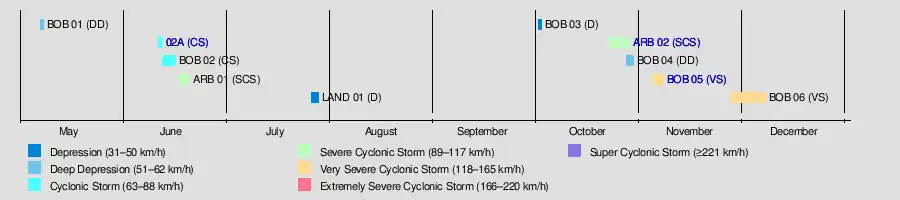 The IMD tracked nine tropical disturbances, including one that developed over land, which is below average of 13 systems. Five of the storms formed from October to December, after the end of the monsoon season. In general, storms moved slower than average, and two of the cyclones took unusual tracks near land – one executed a rare loop in the Bay of Bengal, and another turned abruptly away from the Indian state of Gujarat.[1] According to the JTWC, activity in the basin was 60% greater than average, with eight tropical cyclones. Four of these storms attained hurricane intensity – winds of at least 120 km/h (75 mph) – which was a record at the time.[3]
