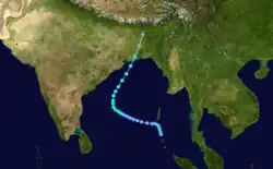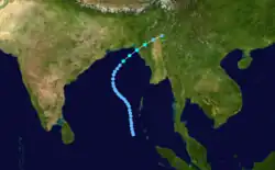 The monsoon trough produced an area of convection south of the Andaman and Nicobar Islands on October 21. Located south of a ridge, the system moved westward through an area of hostile wind shear, which prevented quick development by displacing the circulation east of the convection.[3][6] The JTWC issued a TCFA on October 22 once it appeared the shear was decreasing, although the system did not organize initially. After the convection became more defined, the JTWC classified the system as Tropical Cyclone 06B on October 25 in the central Bay of Bengal.[3] An approaching trough from the west weakened the ridge, allowing the storm to turn to the north and later northeast.[6] The IMD classified the system as a depression on October 27, and later that day estimated peak 3-minute winds of 55 km/h (35 mph), making it a deep depression.[1] The JTWC assessed a higher intensity of 85 km/h (55 mph). Accelerating northeastward, the storm made landfall near the border of India and Bangladesh around 18:00 UTC on October 28.[3] Moving through Bangladesh, the system quickly weakened and degenerated into a remnant low on October 29 over the Indian state of Assam.[1]