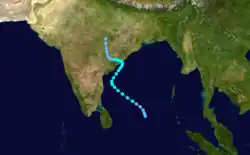 On June 9, a disturbance began forming within the monsoon trough off the southeast coast of India. Inflow from the south helped the system organize,[18] and the convection became more defined on June 11. At 06:00 UTC the next day, the JTWC classified the system as Tropical Cyclone 03B,[3] and three hours later the IMD classified it as a depression.[1] A ridge to the east initially steered the system to the northwest, although an approaching trough turned it to the northeast, parallel to the coastline.[18] Early on June 13, the JTWC assessed peak 1-minute winds of 85 km/h (55 mph),[3] and on the next day, the IMD upgraded the system to a cyclonic storm. Both the intensity and the track were unusual for the month of June. At 00:00 UTC on June 16, the IMD estimated peak 3-minute winds of 85 km/h (55 mph), around which time the storm turned back to the northwest. Five hours later, the storm made landfall near Visakhapatnam, Andhra Pradesh, and it rapidly weakened into a remnant low.[1] The JTWC continued tracking the remnants until June 18 when the system was over Madhya Pradesh.[3]
