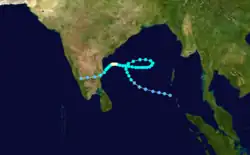Originating from the monsoon trough, a well-defined circulation persisted on November 26 near the Andaman and Nicobar Islands, accompanied by a poorly defined area of convection.[3] It formed in an area of moderate wind shear,[40] allowing the system to slowly organize while moving to the west-northwest.[3] Both the IMD and the JTWC initiated warnings on November 28, the latter classifying it as Tropical Cyclone 08B.[1][3] On November 29, the storm turned to the north and east, beginning a four-day loop in the central Bay of Bengal; the JTWC noted that it was the longest-lasting loop on record in the body of water.[3] During this time, the system remained weak, never intensifying beyond deep depression status.[1] A strengthening ridge to the north turned the storm back to the west on November 30 into an area of lighter wind shear.[6] On December 2, the system intensified into a cyclonic storm and eventually to a very severe cyclonic storm on the next day, with the IMD estimating peak 3-minute winds of 120 km/h (75 mph).[1] The JTWC upgraded the system to the equivalent of a hurricane on December 4, estimating peak 1-minute winds of 140 km/h (85 mph).[3] Increased wind shear decoupled the convection from the center; the thunderstorms continued to the west-northwest and struck Andhra Pradesh, while the circulation turned southwestward. Weakening further, the system made landfall on Tamil Nadu between Chennai and Pondicherry around 16:00 UTC on December 6. It rapidly weakened over land, dissipating the next day.[1][3]