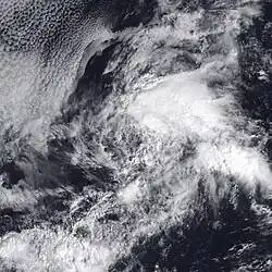 On May 15 an area of disturbed weather in the Intertropical Convergence Zone developed into a tropical depression. The disturbance was not readily traceable back to a tropical wave from the Atlantic. On its first day of its existence, Tropical Depression Two-E was a well-organized system with maximum sustained winds of 35 mph (56 km/h) and a minimum central pressure of 1,006 mbar (29.7 inHg).[15] As it slowly moved west, Two-E experienced a few intermittent bursts of convection. However, the depression gradually became less organized during the remainder of its life. On May 18, the cyclone's organization deteriorated markedly until it dissipated the next morning.