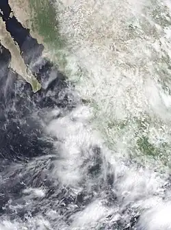 After making landfall along the Bay of Campeche coast north of Tuxpan, Veracruz, Hurricane Dolly managed to maintain its tropical characteristics while crossing the Mexican Plateau, and entered the eastern Pacific as a tropical depression late on August 24. Though the system entered the eastern Pacific intact, the National Hurricane Center did not re-classify it as an eastern Pacific tropical depression, nor were any coastal advisories issued. No re-intensification occurred after the system entered the eastern Pacific, and it dissipated early the following day, just west of San Juanito in the Islas Marías.[27]
