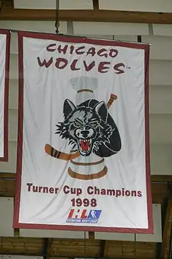 The banner honoring the Chicago Wolves 1998 Turner Cup Championship hanging in the Allstate Arena