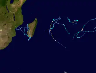 During the year, the Météo-France office on Réunion (MFR) issued warnings for tropical systems in the region as the Regional Specialised Meteorological Centre.[1] In the year, MFR tracked tropical cyclones south of the equator from the coast of Africa to 90° E.[2] The Joint Typhoon Warning Center also issued warnings in an unofficial capacity.[3]