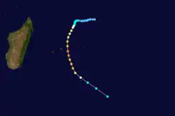 On February 16, Cyclone Victor crossed into the basin from the Australian Region with a well-defined circulation but little convection. Despite being downgraded to a tropical disturbance, the system was named Cindy by the Mauritius Meteorological Service on February 16. The system continued gradually weakening while turning more to the southwest, dissipating on February 19.[1] This marked the end of a 50‑day period in which the related storms Katrina and Victor-Cindy were active.[15]