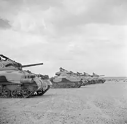 The division's next action was in March 1943, when it joined the Battle of the Mareth Line after having entered Tunisia following the conclusion of the pursuit.[109] This was followed by an attack towards Wadi Akarit on 29 March and its embroilment in the Battle of Wadi Akarit one week later.[110] During April, the division was assigned to the First Army, which had advanced from Algeria into Tunisia. It was then redesignated as the 1st British Armoured Division to avoid confusion with the American 1st Armored Division. At this time, the Allied tanks were painted green to replace their prior desert camouflage colours.[111][112] The division then took part in Operation Vulcan from April 23, and fought at El Kourzia. Their final action of the campaign took place on 8 May near Tunis.[113][114] With the conclusion of fighting in Tunisia, the division remained in North Africa until 1944.[113]