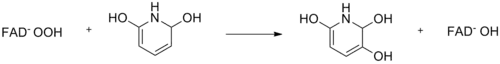 Another reaction of 2,6-dihydroxypyridine highlights its function as a substrate for oxygenase. One example is the enzyme monooxygenase, which oxidizes the substrate by transferring one oxygen atom of O2 to the substrate. The other oxygen atom is reduced to water. The product of the oxidase reaction was determined to be 2,3,6-tri-hydroxypyridine because of the results of the stoichiometry as well as the results of the ultraviolet spectrum. This reaction can be shown by the following equation: