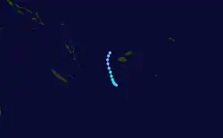 On February 17, a tropical depression formed about 555 km (345 mi) northeast of Fiji and tracked southward. A strong convergence east of the depression produced an area of 65–75 km/h (40–47 mph) winds with gusts to 95–110 km/h (59–68 mph). The system was last noted on February 18 well to the southeast of Fiji.[14][24] On February 26, Tropical Disturbance 11F formed 695 km (432 mi) north of Nouméa, New Caledonia. A weak system, having winds no more than 30 km/h (19 mph), it remained nearly stationary for about a day before the FMS discontinued advisories on the disturbance.[14] Tropical Depression 14F formed on March 20 about 120 km (75 mi) southeast of Pago Pago, American Samoa. Initially the system was quasi-stationary; however, it was relocated the following day due to its broad size. The depression subsequently drifted west-southwestward and was last noted on March 23 when it was located approximately 835 km (519 mi) south-southeast of Fiji. Throughout its existence, gale warnings were issued along the periphery of the system due to a pressure gradient between the cyclone and an area of high pressure northeast of New Zealand.[16] On April 1, Tropical Depression 15F formed well to the northwest of New Caledonia. The depression drifted east-southeast before dissipating the following day. The last cyclone of the season, Tropical Depression 16F, formed on April 17 about 595 km (370 mi) north-northeast of Port Vila, Vanuatu. After relocating substantially to the south, the depression moved slowly in the same general area for several days before dissipating on April 22.[18] For unknown reasons, the numbering for the 2001–02 season was used for the first system of the 2002–03 season, Tropical Depression 17F, which formed on July 3.[25]