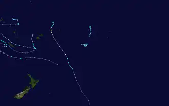 In addition to the storms listed above, the FMS monitored several weak tropical depressions and a tropical disturbance throughout the season. On December 8, Tropical Depression 02F developed near Fiji.[21] Tracking westward, the system attained a peak intensity of 45 km/h (28 mph) with a minimum pressure of 1000 mbar (hPa; 29.53 inHg) before weakening took place.[22] By December 10, the system transitioned into an extratropical cyclone.[21] Over the following several days, the remnants of the depression drifted southeastward and were last noted on December 15 to the southeast of Fiji.[22] On January 15, Tropical Depression 06F formed about 835 km (519 mi) west-northwest of Nouméa, New Caledonia. Embedded within a monsoon trough,[11] the system tracked generally eastward and attained peak winds of 65 km/h (40 mph).[12] The strongest winds were located well to the south of the system in a peripheral band. By January 16, the system began weakening as it interacted with a frontal system near New Caledonia before completely losing its identity later that day.[11] On January 20, a large tropical depression, designated 07F, formed about 325 km (202 mi) northwest of Fiji. A monsoonal system, the depression failed to organize a definite center and relocated several times throughout its existence. Between January 21 and 24, gale warnings were issued in association with the cyclone due to a strong pressure gradient between it and an anticyclone to the south.[11] Tracking generally southwestward, the system slowly deepened, attaining a minimum pressure of 997 mbar (hPa; 29.44 inHg) early on January 27 before the FMS discontinued advisories on the storm.[11][23]