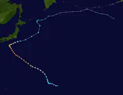 In the beginning of April, a tropical disturbance developed along the southern end of a stationary cold front west of Enewetak Atoll.[11] While gradually organizing, the system produced gale-force wind gusts in Micronesia.[25] On April 5, the JTWC initiated advisories on Tropical Depression 04W. The system moved northwestward due to a nearby extratropical storm, which later caused the depression to also become extratropical about 650 km (400 mi) west-southwest of Wake Atoll.[11] The JMA issued its last advisory on April 8.[11]