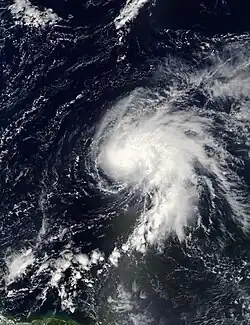 A strong tropical wave moved off the coast of Africa on August 14,[56] and after tracking steadily westward an area of convection began to become better organized on August 18.[57] After it tracked through the Lesser Antilles, it developed into Tropical Depression Nine on August 21 to the south of Puerto Rico. The depression quickly showed signs of organization, and forecasters predicted the depression to intensify to a strong tropical storm.[58] However, strong southwesterly wind shear unexpectedly became established over the system, and the depression degenerated into a tropical wave late on August 22 to the south of the eastern tip of the Dominican Republic.[56]