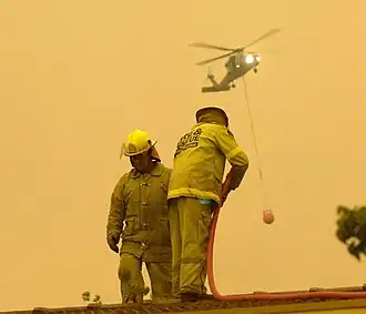 On 13 January, a Bell Jet Ranger helicopter that had been waterbombing the fires in the forests west of Canberra crashed into Bendora Dam with one person, pilot Duncan Patrick, injured. The pilot was reloading water buckets from the dam at the time of the crash. ACT Chief Minister Jon Stanhope and ACT Chief Fire Control Officer Peter Lucas-Smith were reviewing the fires nearby during a routine bushfire surveillance flight in the Snowy Hydro SouthCare helicopter. The unconscious pilot had been pulled from the sinking wreckage by a SouthCare rescue helicopter medical crewman Euan McKenzie, but due to the weight of his clothes and lack of life vest, was unable to be dragged from the water.[2][3] The pilot of the Southcare chopper cautiously positioned his aircraft to allow Stanhope, Lucas-Smith and a paramedic on board to dive into the dam and bring the injured pilot about 60 metres to shore for resuscitation by Lucas-Smith and McKenzie.[4][5][6][7] The pilot had head injuries and underwent emergency surgery at Canberra Hospital.[8]