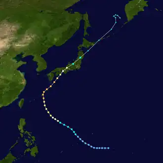 A tropical disturbance persisted in the monsoon trough northwest of Pohnpei on June 7, and moved westward without development due to wind shear.[18] On June 11, the shear decreased enough to allow the convection to organize,[13][18] and the next day the JMA classified it as a tropical depression northeast of Palau. On June 13, the JMA upgraded it to Tropical Storm Soudelor to the east of the Philippines,[12] and PAGASA gave it the local name "Egay".[50] Soudelor moved to the northwest and later to the north, parallel to the eastern Philippines, and on June 17, the JMA upgraded it to typhoon status.[12] The storm rapidly intensified to the east of Taiwan as it developed a well-defined eye,[18] and while doing so passed over the Japanese island of Iriomote-jima at around 2030 UTC on June 17.[12] At 0600 UTC on June 18, the JTWC estimated peak 1 minute winds of 215 km/h (134 mph),[13] while the JMA estimated peak 10 minute winds of 150 km/h (93 mph).[12] Increased shear weakened the typhoon to tropical storm strengthen on June 19, and later that day the JMA declared the storm as extratropical near the Oki Islands. The extratropical remnants of Soudelor continued to the northeast, crossing northern Japan on June 20 and dissipating on June 24.[12]