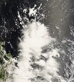 On January 11, the JTWC began monitoring the disturbance that would eventually develop into Yanyan near the International Date Line. As the system tracked westward, it gradually moved into a more favorable environment for tropical cyclogenesis. On January 14, surface observations indicated that the low-pressure area had developed a closed, low-level circulation center indicative of a tropical cyclone, satellite imagery remained inconclusive.[30] Nonetheless, the JMA classified the pressure area as a tropical depression west of the Marshall Islands at 0600 UTC on January 15.[12] The JTWC would follow suit by classifying the storm as such at 1800 UTC later that day. At the time, the depression was tracking west-northwest under the influence of a subtropical ridge to the north.[13] Over the next day the system waned in convective activity before resuming its previous track and accelerating. At 0000 UTC on January 17, the JTWC upgraded the system to tropical storm intensity, though the storm remained nameless as the JMA continued to classify it as a tropical depression.[12][30]