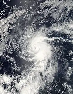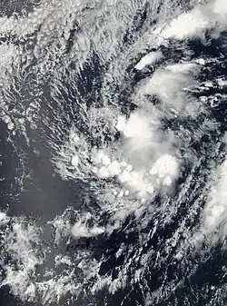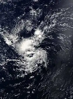 An organized region of convection within the Intertropical Convergence Zone developed into a tropical depression at 03:00 UTC on July 5 while located roughly 700 mi (1,100 km) south-southeast of Johnston Atoll, becoming the farthest-south-forming central Pacific tropical cyclone since Tropical Storm Hali (1992). Steered westward, the depression failed to intensify due to its quick forward motion despite a seemingly favorable environment, and it quickly dissipated at 00:00 UTC on July 6.[18]