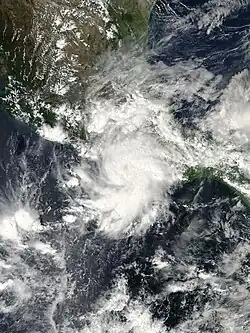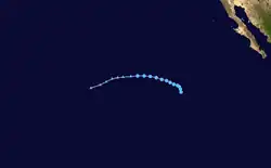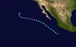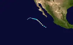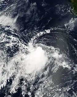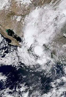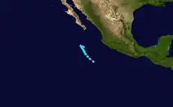 A westward-moving tropical wave from Africa crossed Central America into the eastern Pacific in late June, coalescing into a tropical depression at 12:00 UTC on July 2 well southwest of the southern tip of the Baja California Peninsula.[16] Steered westward by low-level flow, the depression failed to organize amid wind shear and cooler sea surface temperatures,[17] instead degenerating into a remnant low at 00:00 UTC on July 4. The post-tropical cyclone dissipated a day later.[16]